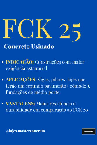 Quanto maior o FCK, maior a resistência do concreto; na prática, um FCK elevado é obtido pela adição de mais cimento em relação aos outros materiais.